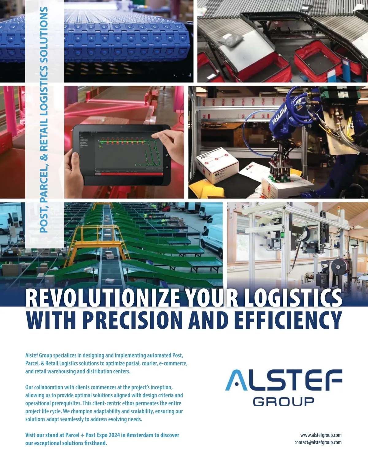 REVOLUTIONIZE YOUR LOGISTICS WITH PRECISION AND EFFICIENCY Alstef Group specializes in designing and implementing automated Post, Parcel, & Retail Logistics solutions to optimize postal, courier, e-commerce, and retail warehousing and distribution centers. Our collaboration with clients commences at the project’s inception, allowing us to provide optimal solutions aligned with design criteria and operational prerequisites. This client-centric ethos permeates the entire project life cycle. We champion adaptability and scalability, ensuring our solutions adapt seamlessly to address evolving needs. Visit our stand at Parcel + Post Expo 2024 in Amsterdam to discover our exceptional solutions rsthand. www.alstefgroup.com contact@alstefgroup.com POST, PARCEL, & RETAIL LOGISTICS SOLUTIONS